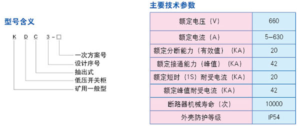 KDC3礦用一般型抽出式低壓開(kāi)關(guān)柜適用于煤礦井下無(wú)瓦斯、煤塵爆炸危險場(chǎng)所或其它類(lèi)似的工業(yè)生產(chǎn)部門(mén),對額定電壓至660V、額定頻率作為50Hz的三相交流低壓配電系統中作為動(dòng)力、配電、照明、電機及其它電氣設備的起動(dòng)、控制和保護的開(kāi)關(guān)設備及電源變換設備。